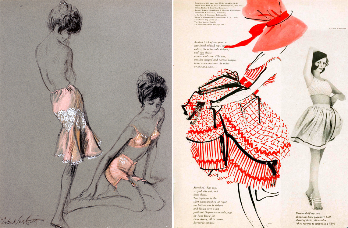 In the course of her successful fashion illustration career, Esta Nesbitt tailored style and media to best suit the fashions she represented. From elegant line drawings and pastels for lingerie to expressionistic red gouache on newspaper for sixties go-go fashions (Figure ), her fluid and bold images translated well into newspaper and magazine advertisements. A fine artist at heart, Nesbitt also experimented with a variety of printmaking techniques such as xerography to create award-winning illustrations for children’s books. Her path eventually led her to Parsons, where she served as an instructor from 1964 through 1974.
