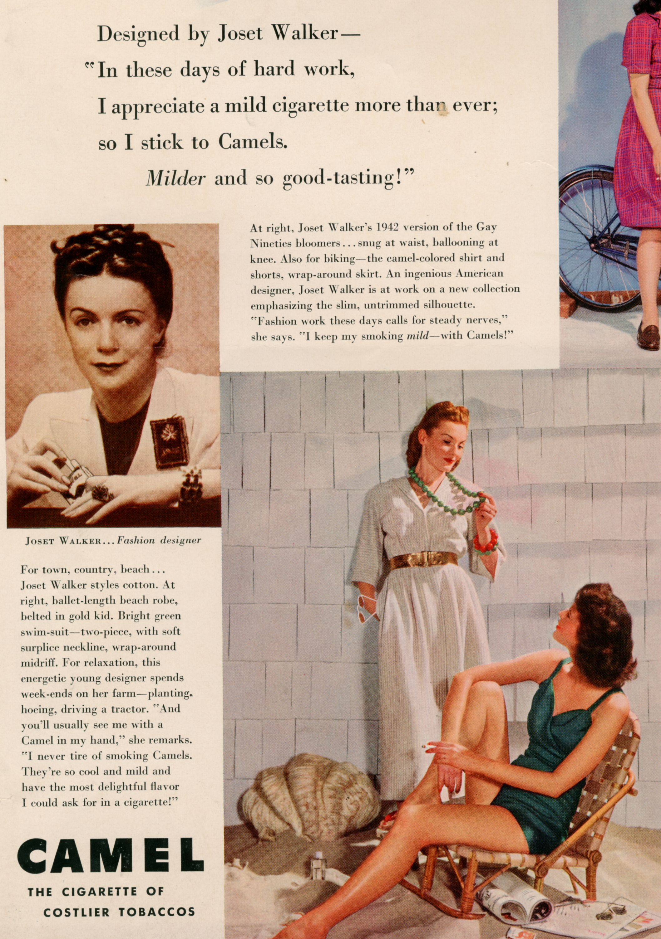 Figure 2. Joset Walker featured in a Camel cigarette magazine advertisement, with the attributed quote, "In these days of hard work, I appreciate a mild cigarette more than ever…”, 1942. The New School Archives